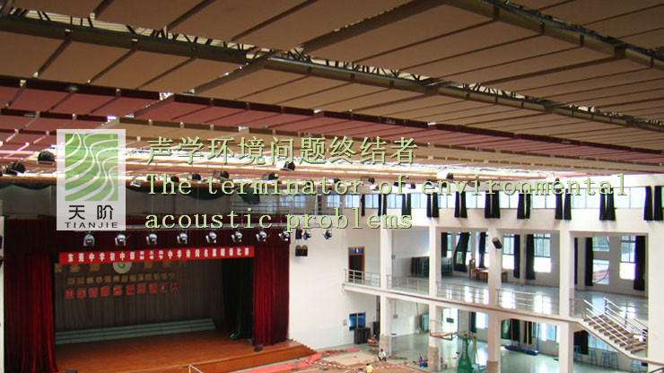 東莞中學(xué)體育館采用的是空間吸聲體。空間吸聲體是一種懸掛在頂棚具有高效吸收性能的吸聲材料。空間吸聲體一般水平或者垂直吊掛。空間吸聲體面積占頂棚面積30%-40%時其材料的吸聲性能是其他聲學(xué)材料吸聲性能的2倍。