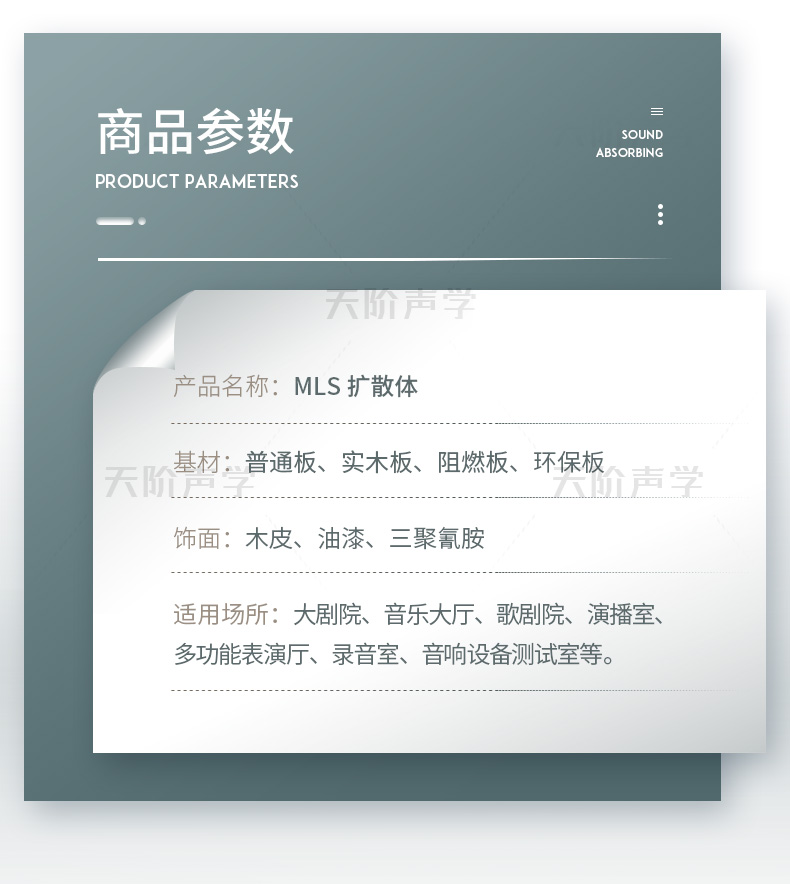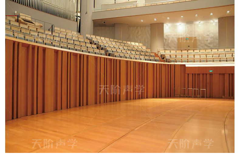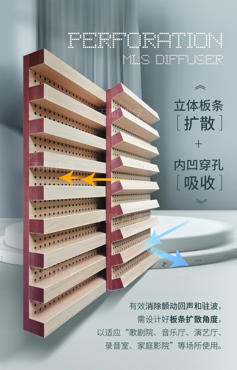 擴散是指聲音朝著許多方向不規則反射、折射和衍射的現象。擴散對“豐滿度”、“活躍度”、“空間感”是有利的,并且能保持豐滿和明晰度之間的平衡,語言清晰度和較長混響時間之間的平衡,還可以保持觀眾廳內音調的自然性。可以讓室內聲能分布均勻,清除回聲等。室內擴散不好,音色往往很粗糙。擴散體就是為改進聲場擴散性能所采用的布置,設計依據是利用不規則界面改變發射聲的波前,或者改變聲阻抗。