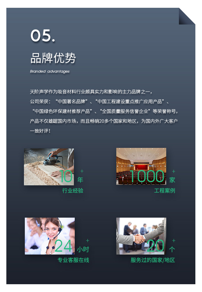 佛山市南海天階聲學(xué)材料廠作為當(dāng)今中國吸音材料行業(yè)具有實(shí)力和影響的主力品牌之一,公司榮獲:“中國著名品牌”、“中國工程建設(shè)重點(diǎn)推廣應(yīng)用產(chǎn)品”、“中國綠色環(huán)保建材推薦產(chǎn)品”、“全國質(zhì)量服務(wù)信譽(yù)企業(yè)”、等榮譽(yù)稱號(hào),產(chǎn)品不僅雄踞國內(nèi)市場(chǎng),而且暢銷多個(gè)國家和地區(qū),為國內(nèi)外廣大客戶一致好評(píng)!