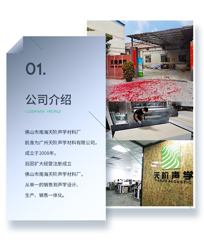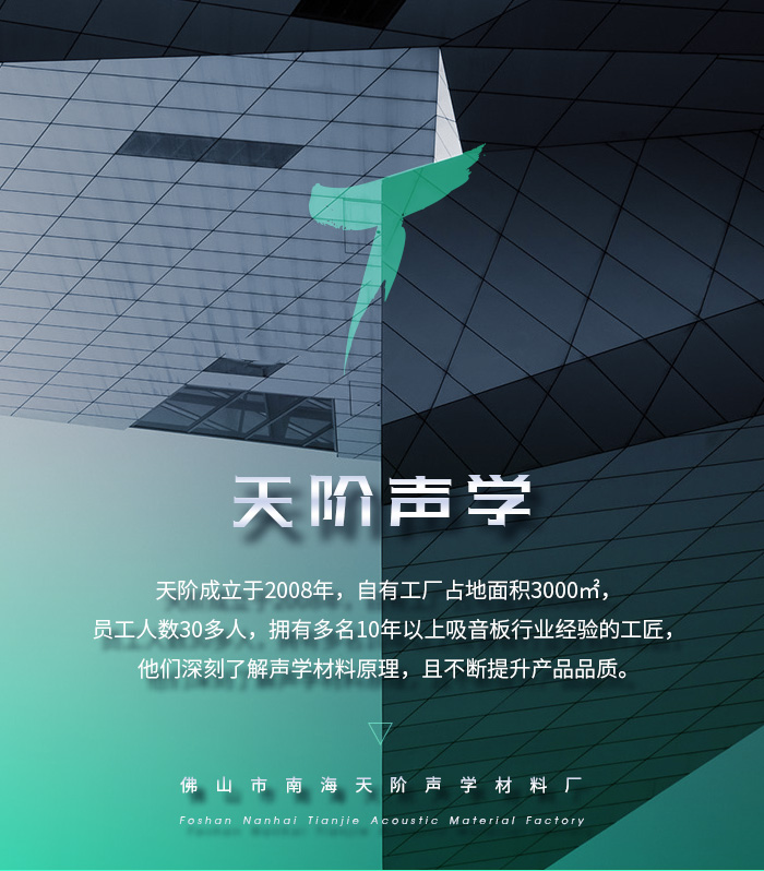 佛山市南海天階聲學(xué)材料廠前身為廣州天階聲學(xué)材料有限公司,成立于2008年,后因擴(kuò)大經(jīng)營注冊(cè)成立佛山市南海天階聲學(xué)材料廠,工廠占地3000多平米,從單一的生產(chǎn)銷售到:聲學(xué)設(shè)計(jì)-生產(chǎn)-銷售-聲學(xué)工程施工一體化,是一家專業(yè)的聲學(xué)環(huán)境解決方案綜合服務(wù)商。