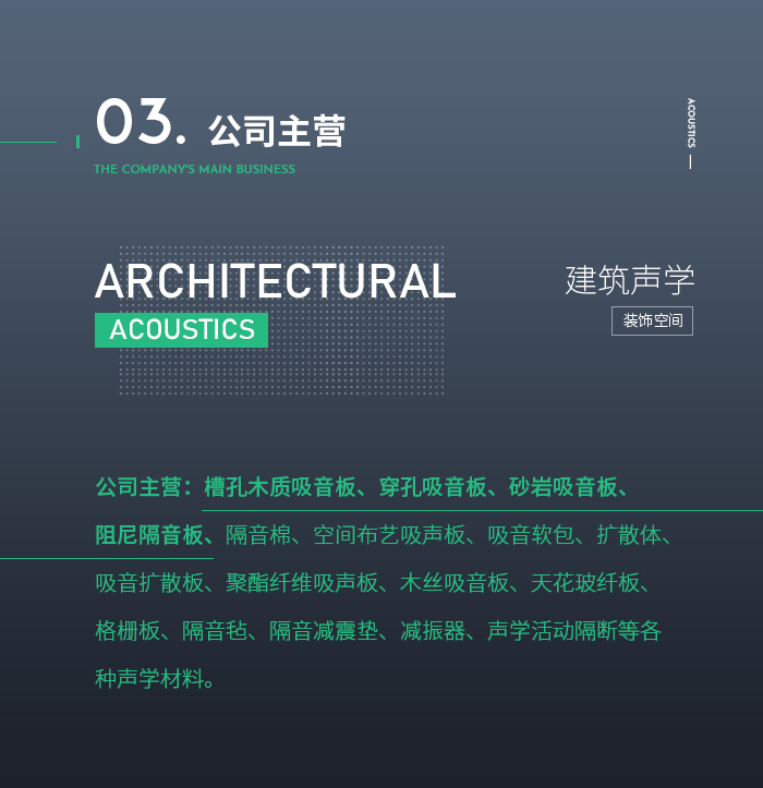 公司主營:槽孔木質(zhì)吸音板、陶鋁吸音板、砂巖吸音板、布藝吸聲板、吸音軟包、微孔吸音板、碳塑吸音板、聚酯纖維吸聲板、隔音板、隔音氈、隔音減震墊、減振器,干掛板與聲學(xué)活動(dòng)隔斷、固定高隔間等各種聲學(xué)材料。