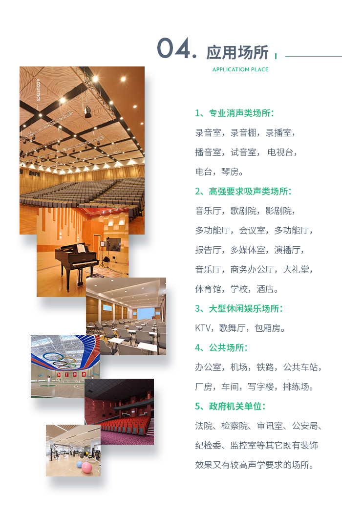2、高強(qiáng)要求吸聲類場(chǎng)所:歌劇院,影劇院,多功能廳,會(huì)議室,多功能廳,報(bào)告廳,多媒體室,演播廳,音樂廳,商務(wù)辦公廳,大禮堂,體育館,學(xué)校,酒店。