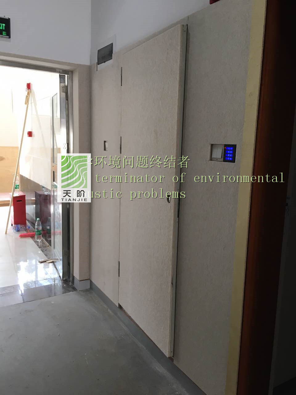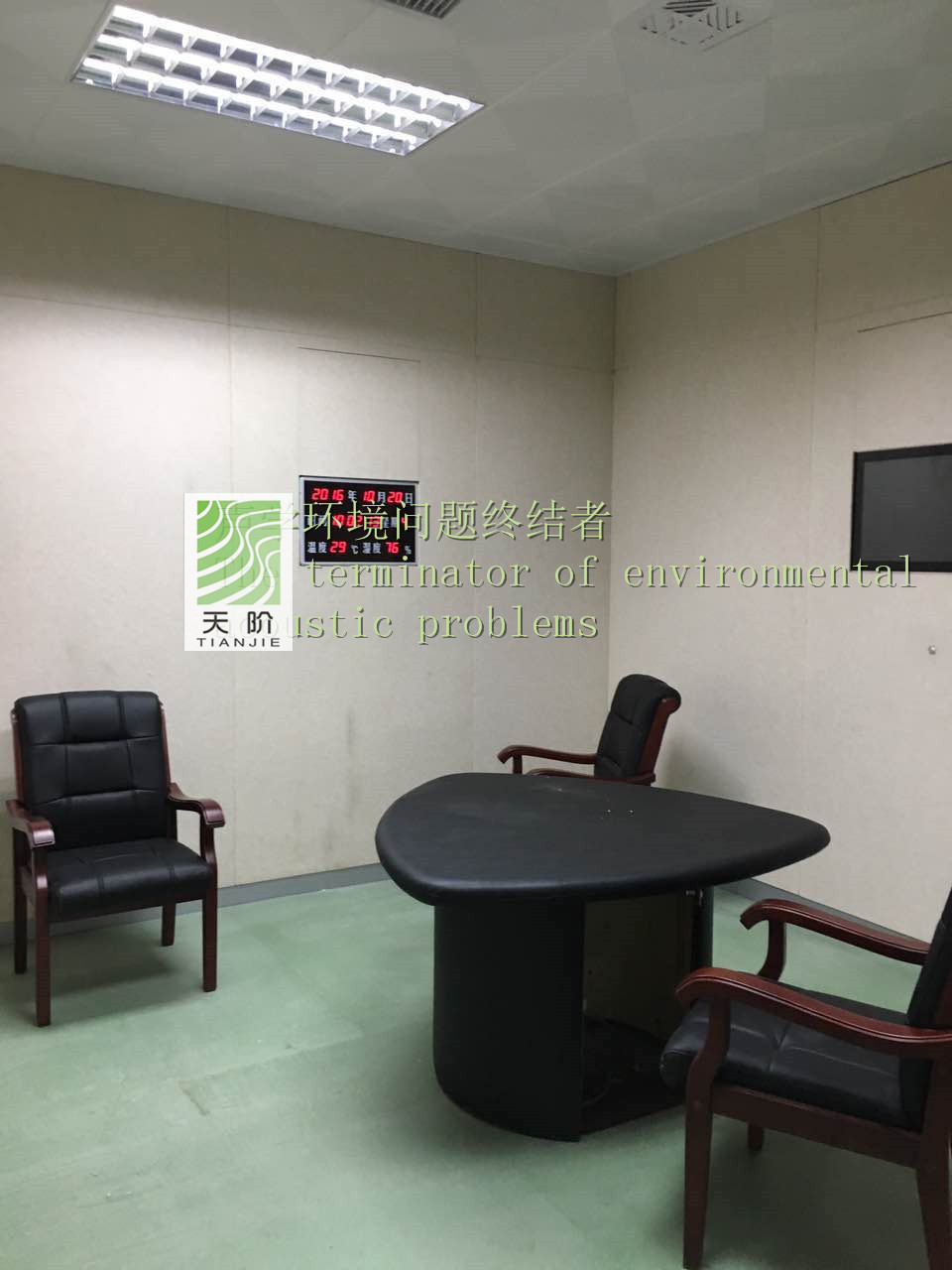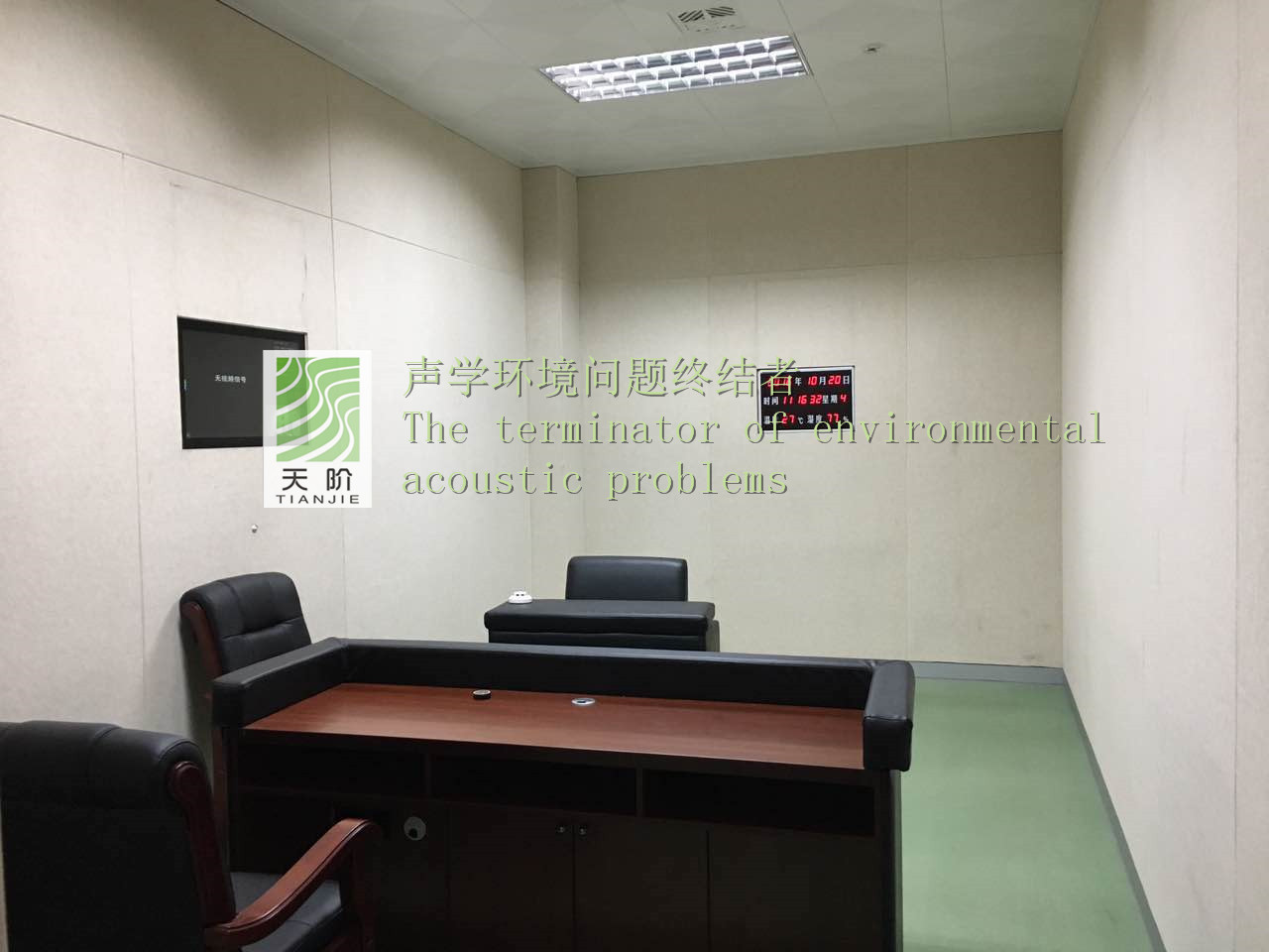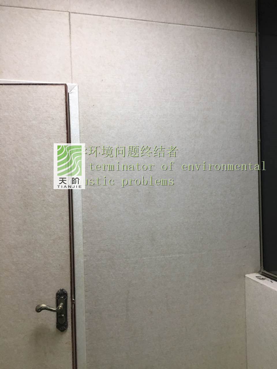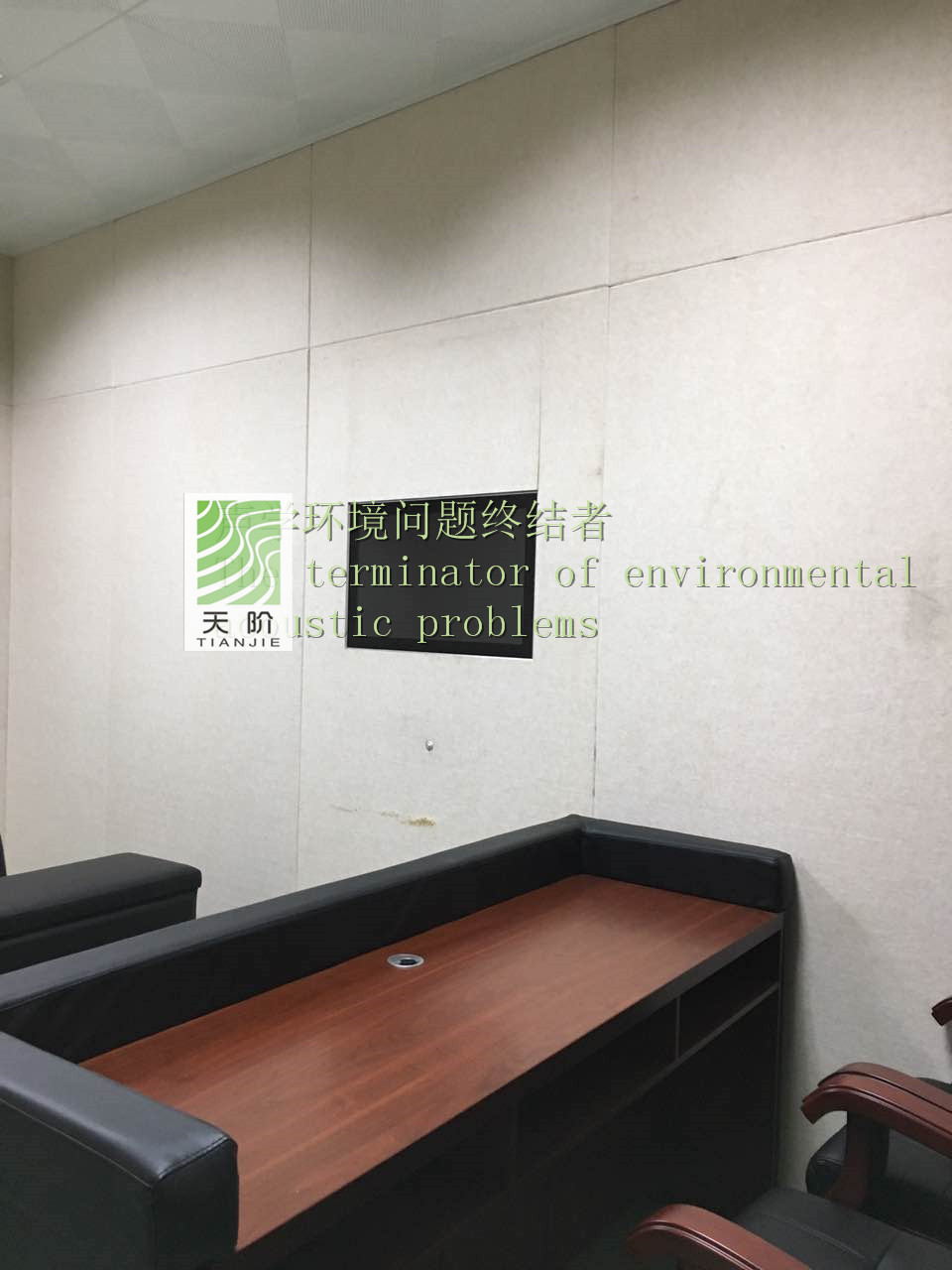此審訊室四周都裝有聚酯纖維吸音板。為了有個更好的審訊環境,甲方要求把門也裝上了聚酯纖維吸音板。