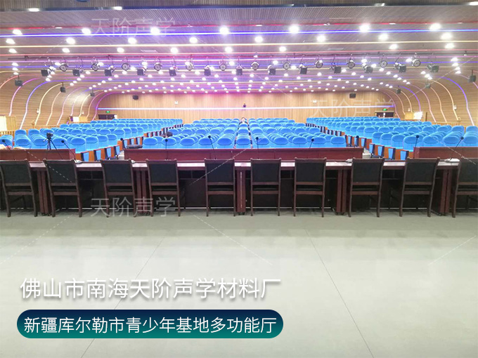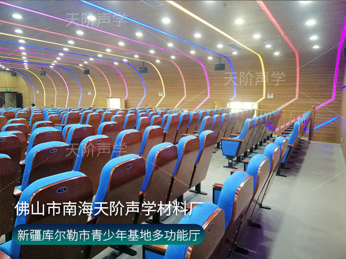 新疆庫爾勒市青少年基地智慧多功能廳項目,天花板和墻面都選用槽木吸音板,基材采用不燃玻鎂基材,安心安心。