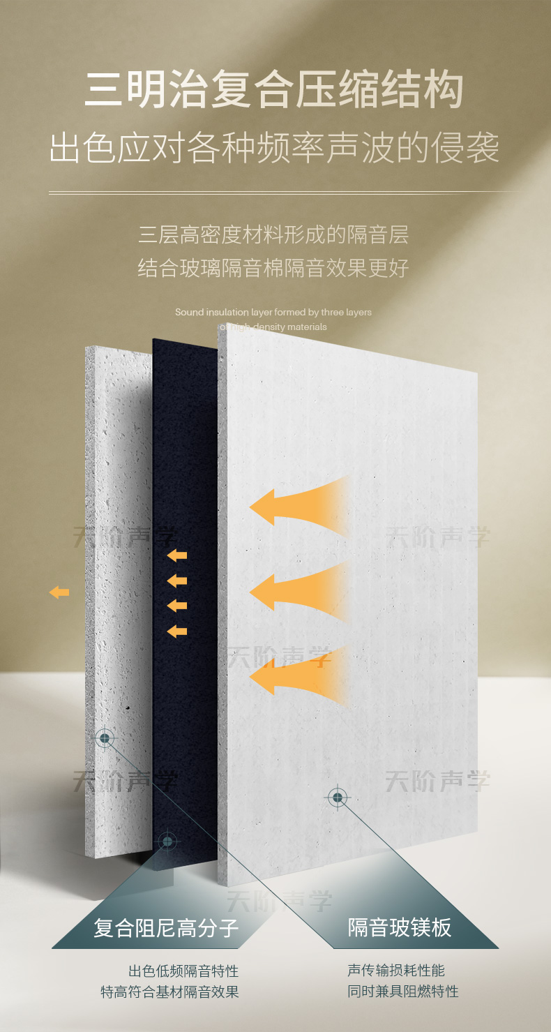 佛山天階吸音板生產(chǎn)廠家 發(fā)布日期:2021-06-15阻尼隔音板采用玻鎂基材,夾加高分子阻尼膠,三文治結(jié)構(gòu)高壓復(fù)合成型,形成阻尼復(fù)合結(jié)構(gòu),改變?cè)馁|(zhì)共振頻率,倍數(shù)提升原有材質(zhì)空氣隔聲量和結(jié)構(gòu)隔聲量。