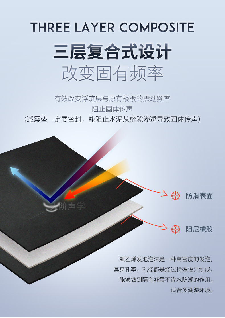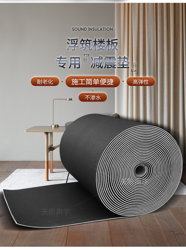減振墊主要應用于KTV、酒吧、健身房、住宅、賓館、酒店、學校、商務大廈;KTV、夜總歌舞廳等娛樂場所及其它需要隔音減振的地方,具有的阻尼減振效果,是一種性價比高的輔助地板材料。