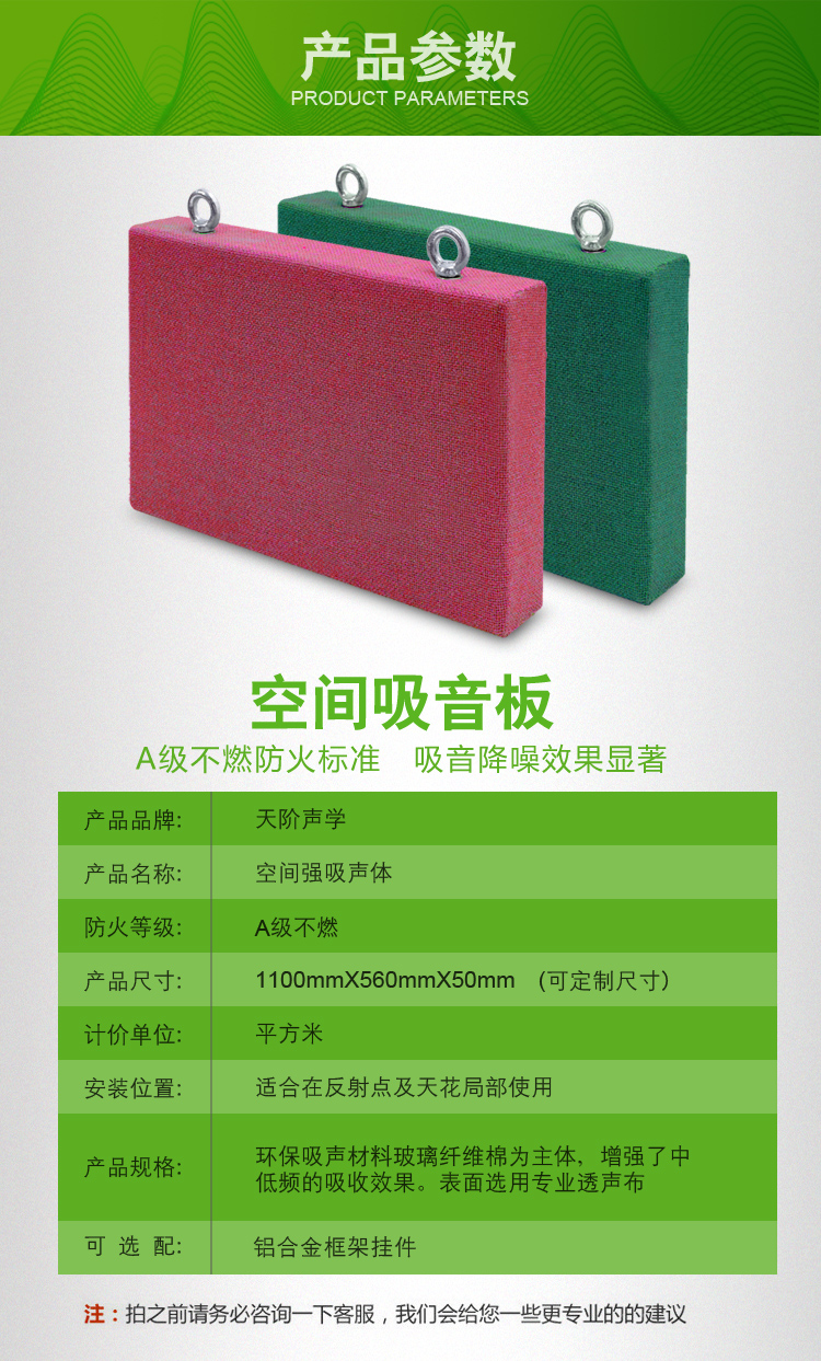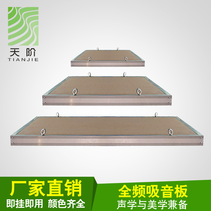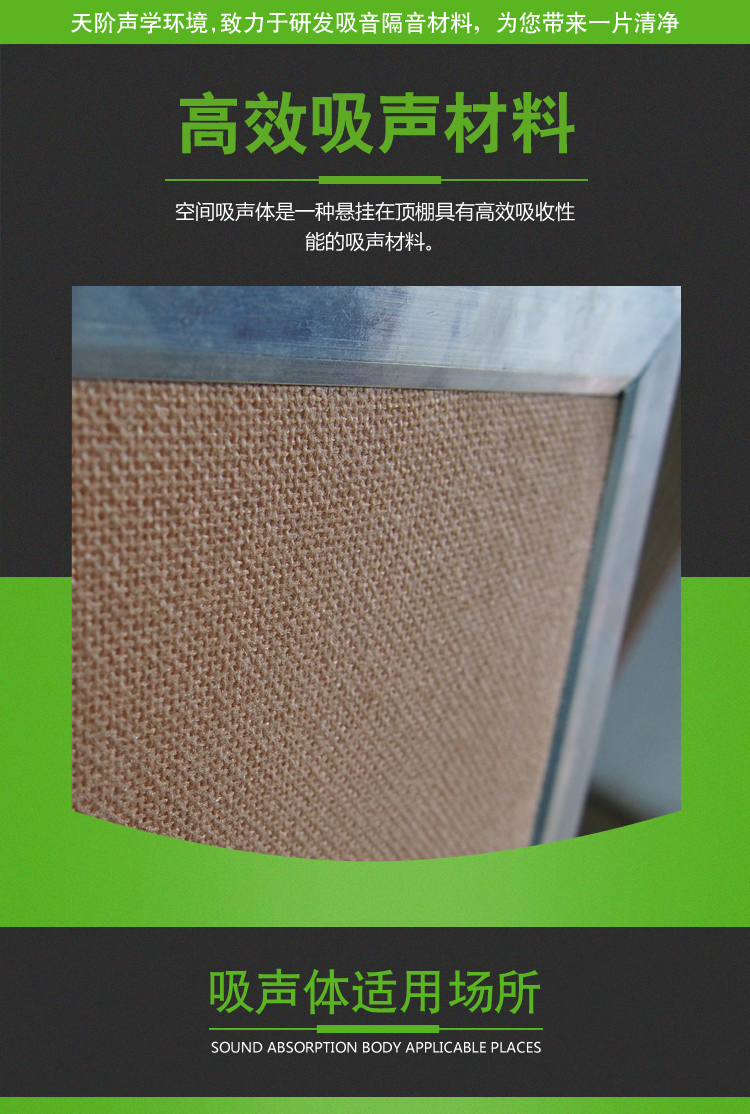 空間吸聲體的吸聲性能常用不同頻率的單個吸聲體的有效吸聲量來表示??臻g吸聲體吸聲降噪(或降低混響時間)的效果主要取決于空間吸聲體的數量、懸掛間距以及材料和結構