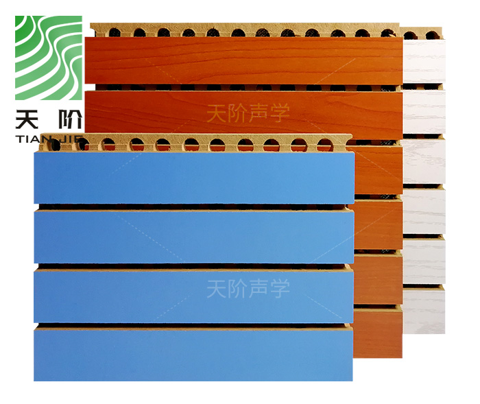 天階聲學材料廠生產的此種天階槽木吸音板由一系列彼此等槽距條組成,通過對槽背面孔徑的大小,深淺,正面槽的寬度,深度以及穿孔率進行嚴格的核算,從而在不同的頻率上取得理想的吸聲效果,有效控制聲波的反射和擴散,消散雜波和噪音,令室骨有合理的混響時間,達到締造音質的吸音效果。