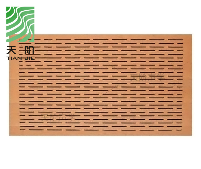 孔木吸音板是一種在密度板上直接穿孔的共振吸聲材料。孔木吸音板對吸聲頻譜選擇性較強,對低頻有很好的吸聲性能。如在吸聲結構后空腔上填入適量的吸聲棉可提高中、高頻吸聲效果。