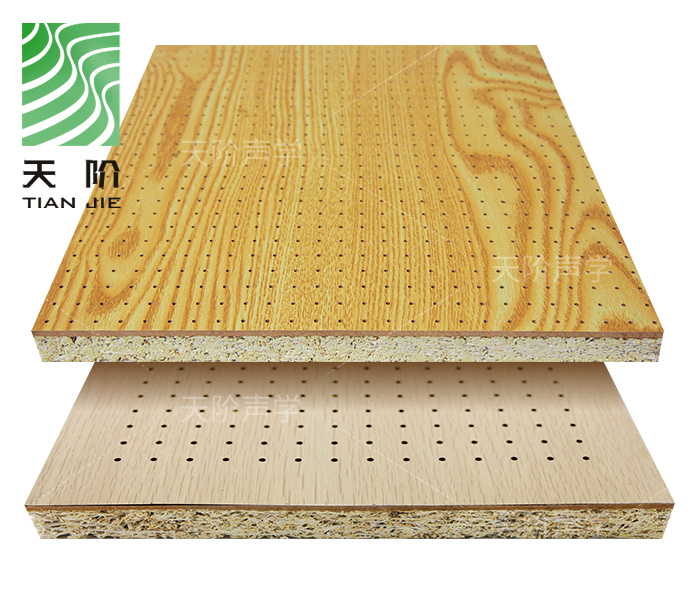 孔木吸音板是一種在密度板上直接穿孔的共振吸聲材料。孔木吸音板對吸聲頻譜選擇性較強,對低頻有很好的吸聲性能。如在吸聲結(jié)構(gòu)后空腔上填入適量的吸聲棉可提高中、高頻吸聲效果。