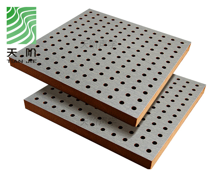 孔木吸音板是一種在密度板上直接穿孔的共振吸聲材料。孔木吸音板對(duì)吸聲頻譜選擇性較強(qiáng),對(duì)低頻有很好的吸聲性能。如在吸聲結(jié)構(gòu)后空腔上填入適量的吸聲棉可提高中、高頻吸聲效果。