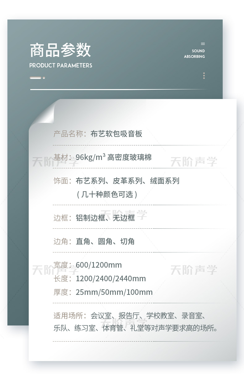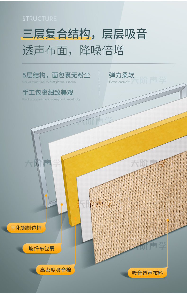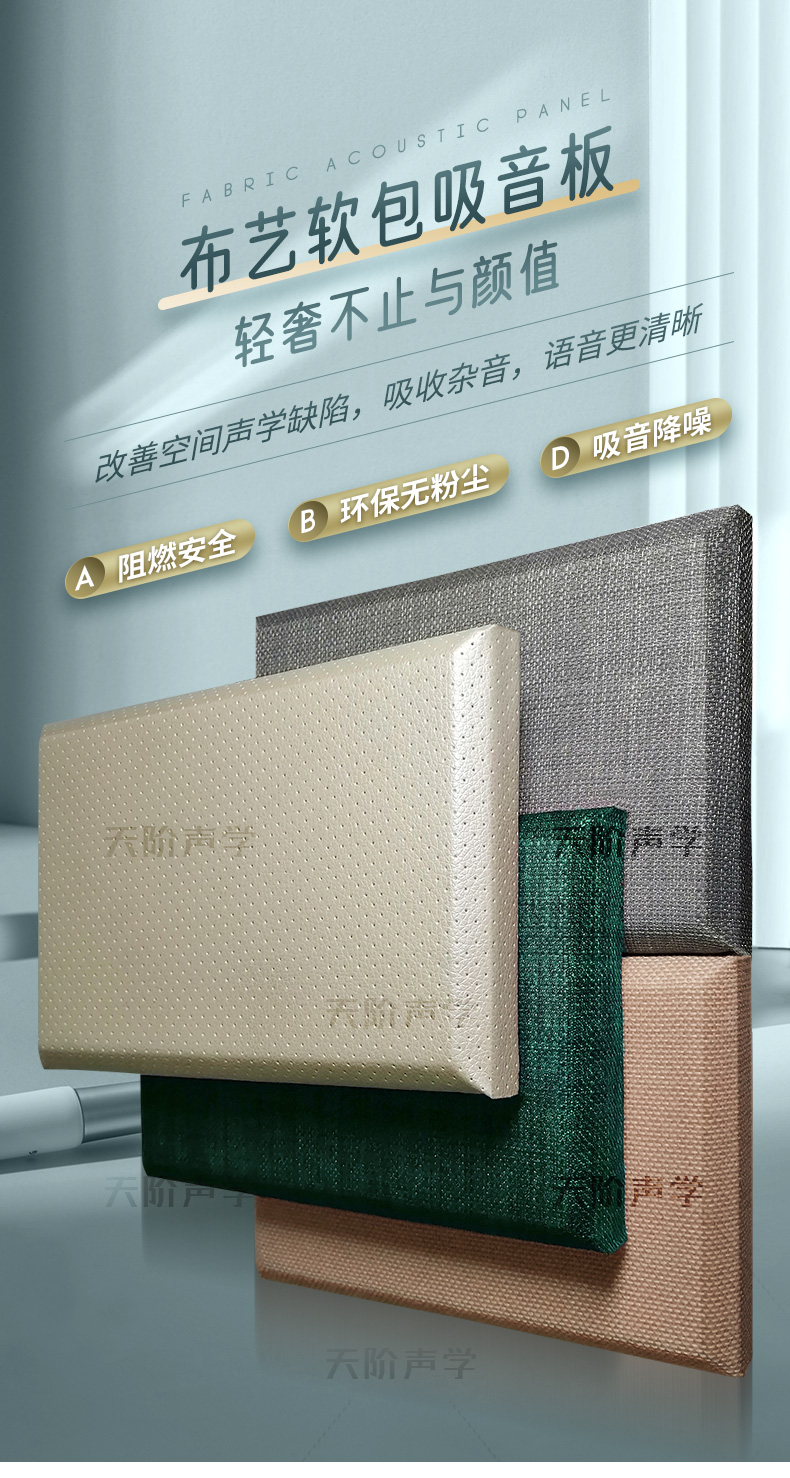 天階聲學布藝吸聲板采用高質(zhì)的96kg/m3玻璃吸音棉。具有環(huán)保、阻燃、吸聲頻帶寬、裝飾性強、施工簡單、無粉塵污染等性能,飾面顏色及材料選擇性廣,能很好地滿足客戶多樣化的聲學及裝飾需求。